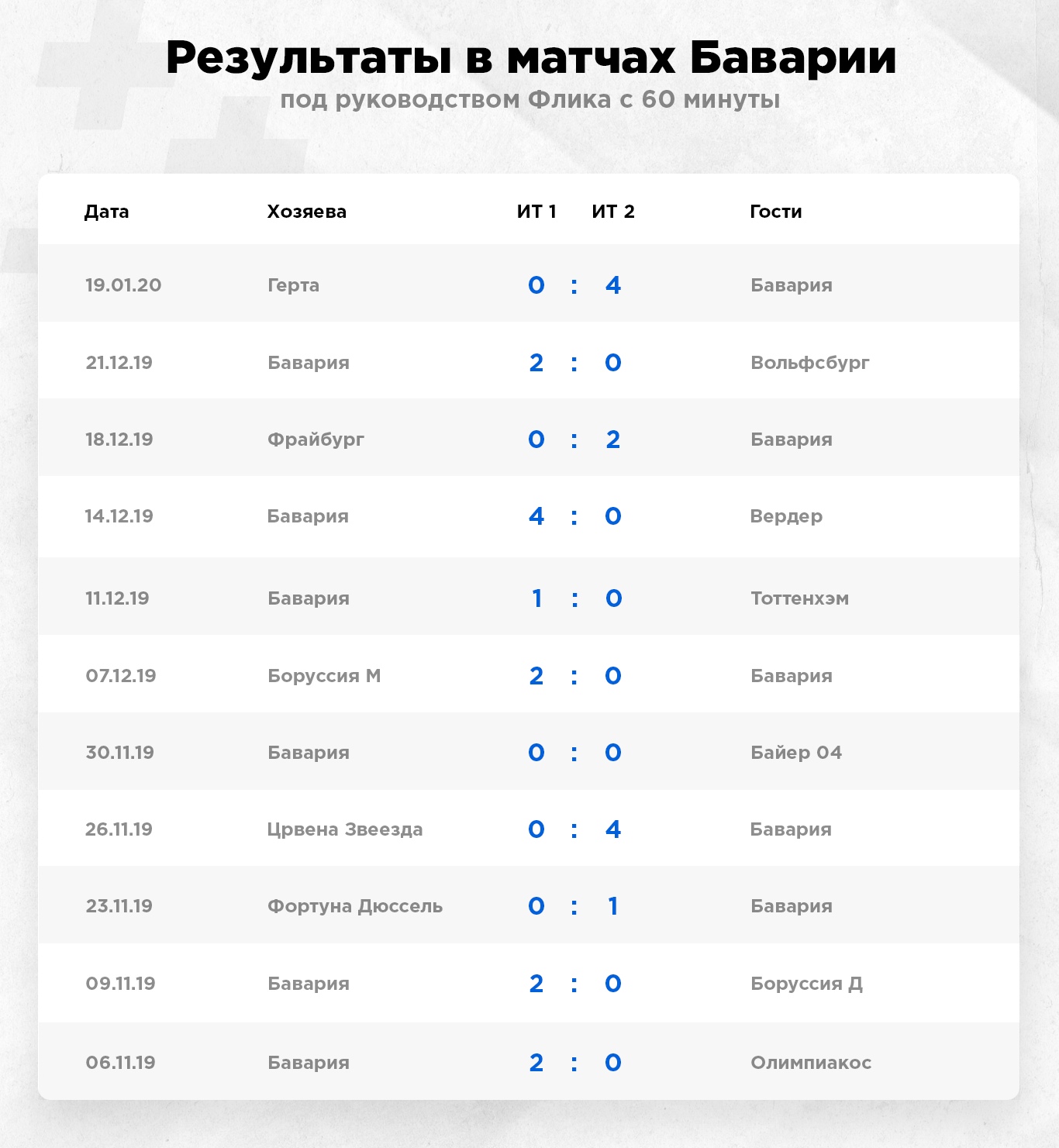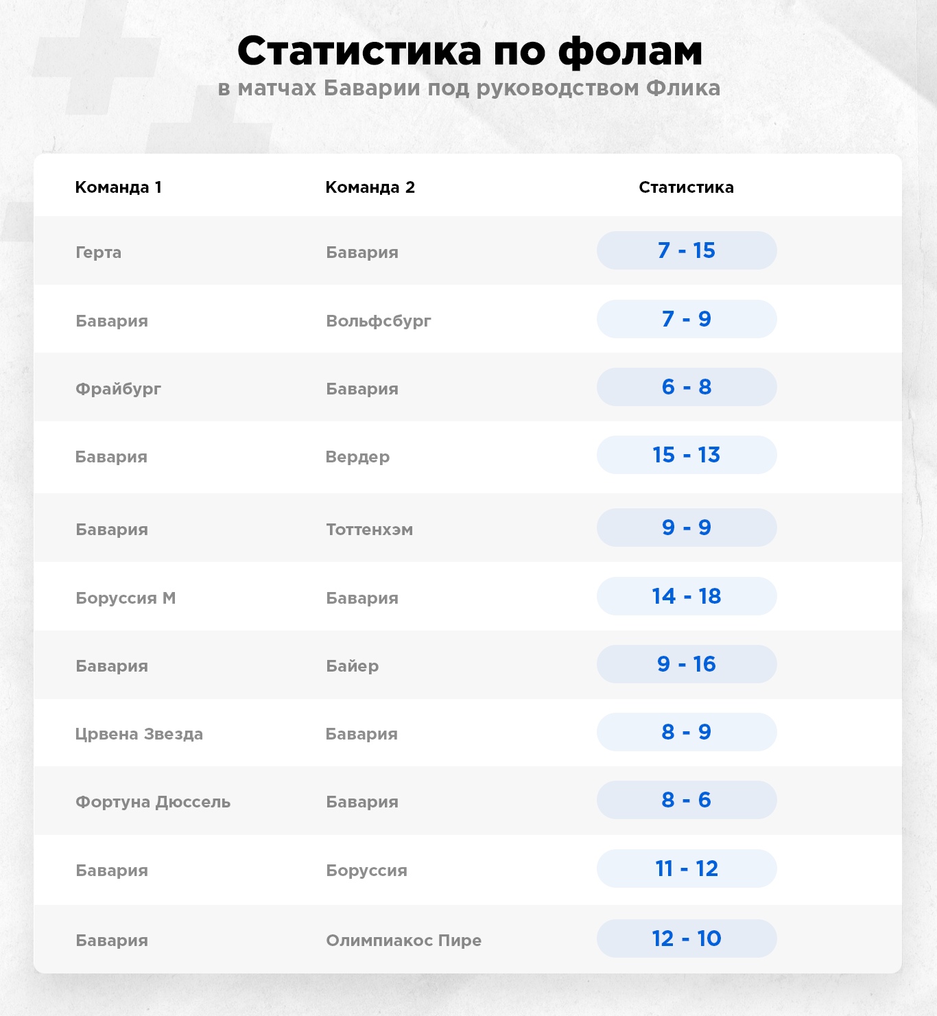 "Бавария" последних сезонов – одна из наименее фолящих команд лиги, со средней разницей фолов в матче примерно +2, наряду с "Боруссией". Для сравнения, при Коваче команда проиграла в 9 из 10 матчей чемпионата по фолам. При Флике уже 4+ 4-. И тренд на победу по фолам в 4 из 5 последних матчей. Статистика фолов практически нулевая, в 11 матчах Флика 119 нарушений у Баварии и 112 у соперников.