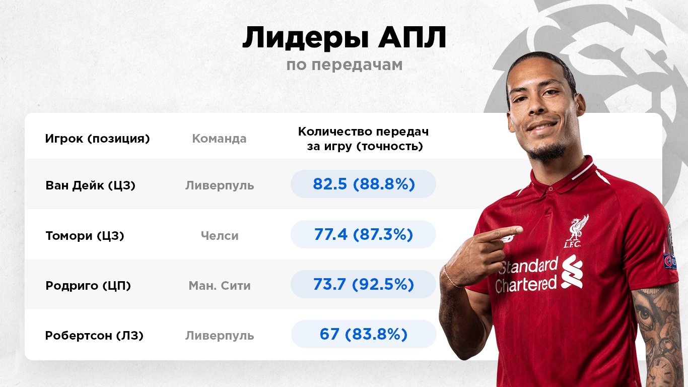 Голландский защитник Вирджил Ван Дейк, помимо игры в обороне, отлично владеет средними и длинными передачами. Он часто начинает атаки своей команды забросами на чужую половину поля. Ван Дейк является лучшим игроком АПЛ по количеству передач.