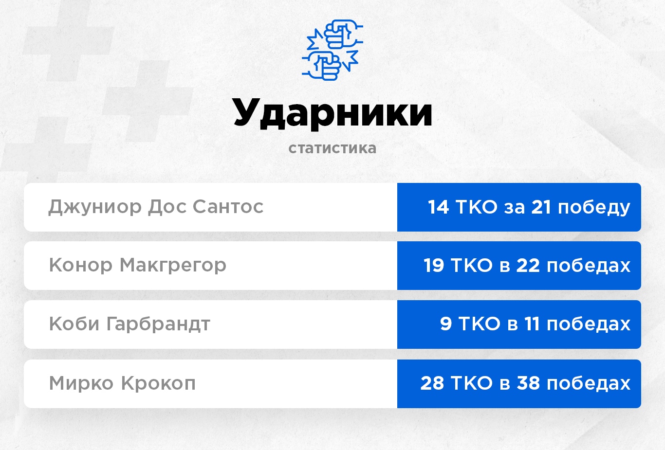 Боксеры в очном мордобое не полезут в партер. Об этом говорит статистика. Конор, который не имеет базовой борьбы, одержал 19 побед из 22 именно техническим нокаутом. Кто у нас еще известный кикер в MMA? Мирко Крокоп все детство долбил ногой стену в гараже, почему имеет 28 побед из 38 ТКО. Коди Гарбрандт достигал больших высот в любительском боксе, так что в MMA американцу не составило труда сделать девять побед из 11 техническими нокаутами. Если борец еще способен сдержать ударную мощь бойца в стойке, то один на один ударники даже не разменяются на проходы в ноги.