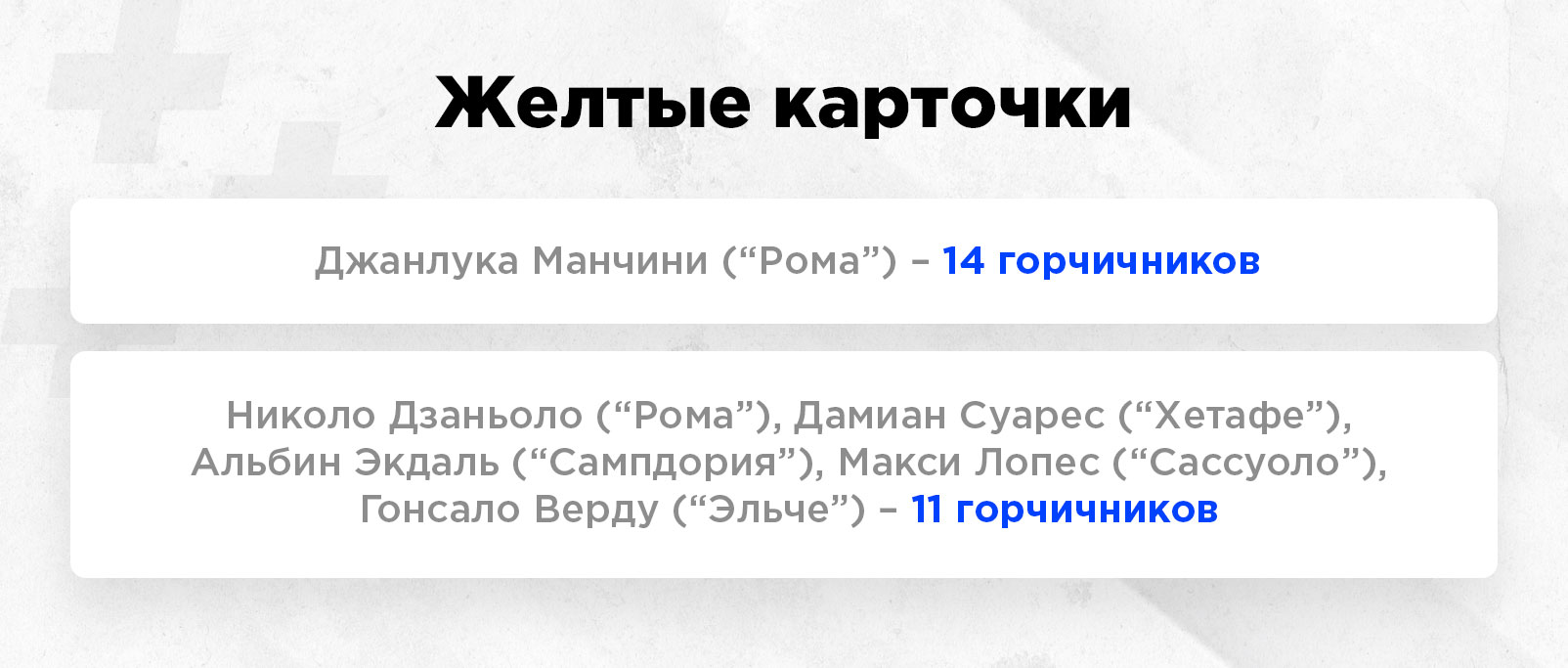 Больше всех карт в топ-5 заработал Манчини. При этом в плане фолов не является самым грубым игроков Серии А даже (их всего 52), но видимо отличается жесткостью. "Рома" в целом не играет мягко и в последние месяцы в матчах с их участием много удалений. Проверять карты Манчини явно можно, хотя игрока могу и вразумить.