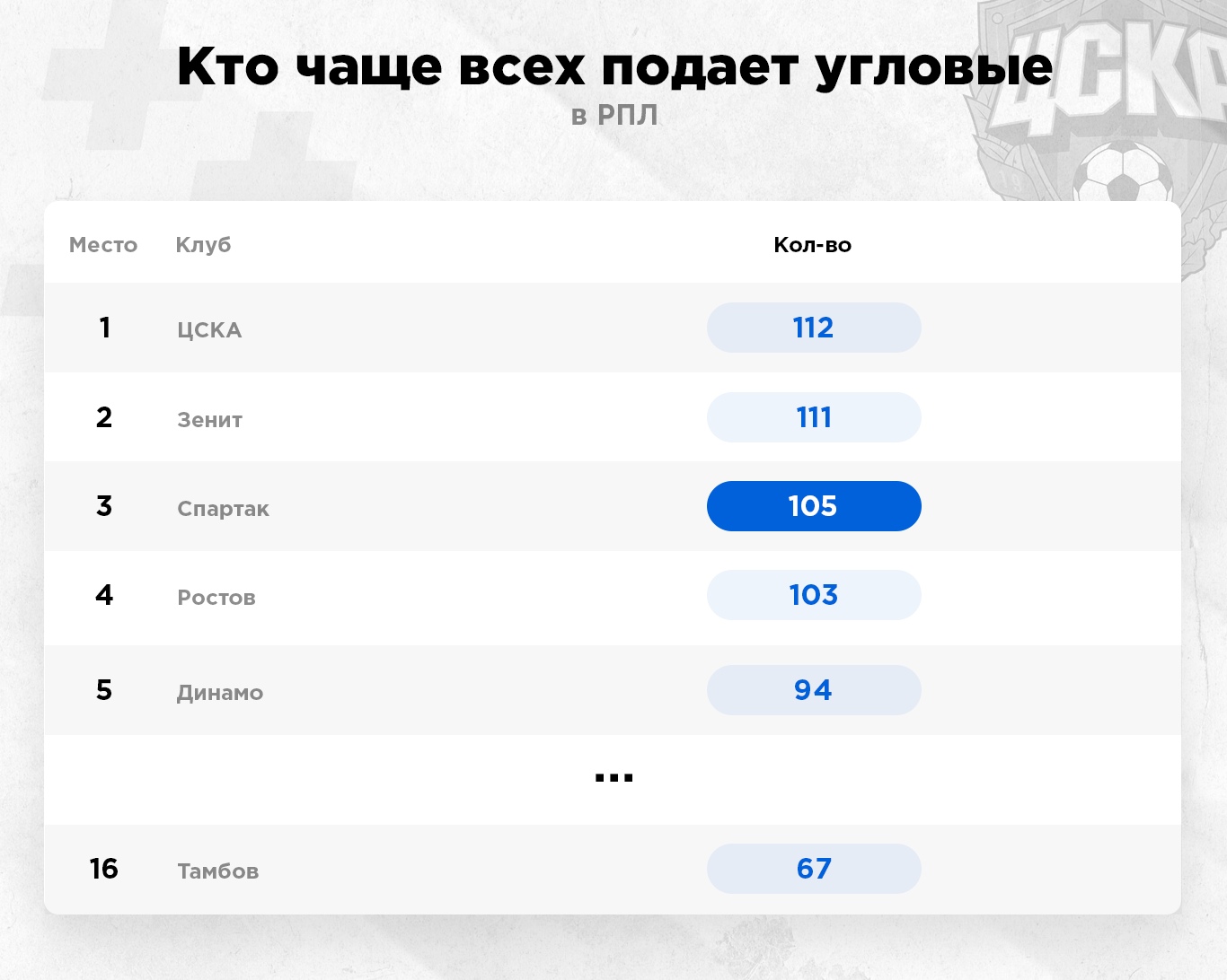 Если же мы возьмем в целом РПЛ, то можно увидеть, что по суммарному количеству угловых “Спартак” (105) проигрывает только “Зениту” (111) и ЦСКА (112). У “Краснодара” 93 угловых, и это шестое место в лиге.