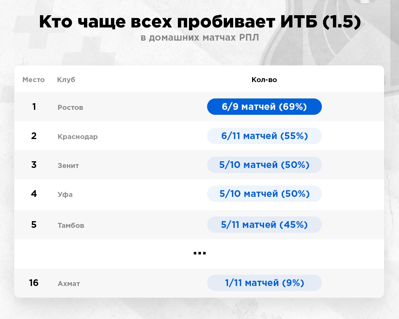 “Ростов” лидер РПЛ по проходу индивидуальных тоталов больше 1,5. У клуба этот тренд работает слишком стабильно: 12/20 или 60% заходов. В домашних встречах ситуация еще благоприятнее: 6/9 и 67% попаданий. Причем “Ростов” забивал больше одного гола и “Локомотиву” в гостях, и “Спартаку, и тому же ЦСКА. Почему бы не повторить этот фокус снова?