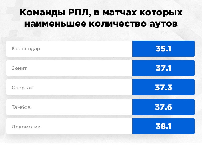 1. Среднее количество аутов - 35.1 за игру. Самая низовая команда чемпионата, что особенно выражается в матчах против слабых соперников. Там аутов еще меньше.