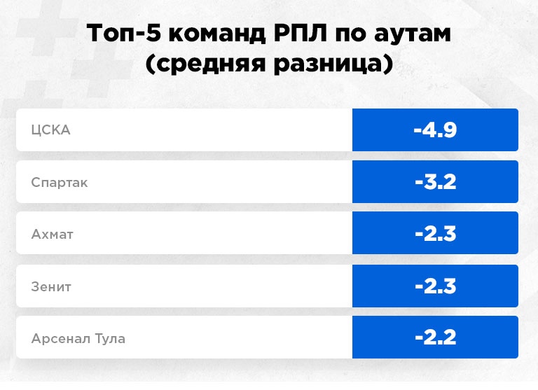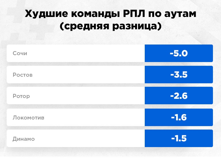 2. "Сочи" - худшая команда РПЛ по аутам. Три победы, две ничьих и 14 поражений. В 15-ти из 19-ти матчей соперником был пробит тотал (19.5) аутов.