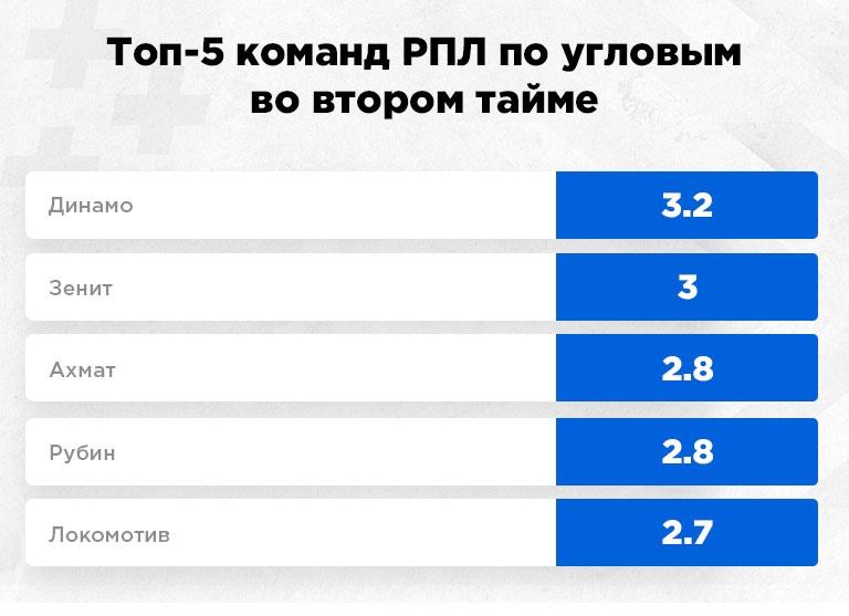 3. У "Динамо" лучшие показатели по угловым во втором тайме. В 14-ти из 19-ти матчей пробили ИТБ(1.5).