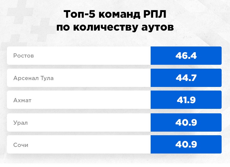 2. В матчах "Ростова" фиксировалось больше всего аутов: в среднем 46.4 за игру.