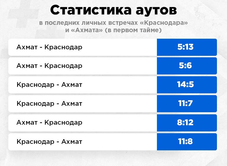 А в матчах с контролем мяча от "Краснодара" есть интересная особенность - в них почти всегда мало аутов. Например, если взять игры с владением от 60%, средний тотал аутов в них 35.8. При среднем тотале лиги 41.6. В тех случаях, когда "Ахмат" играл без мяча, также подходящая статистика - 38.14.