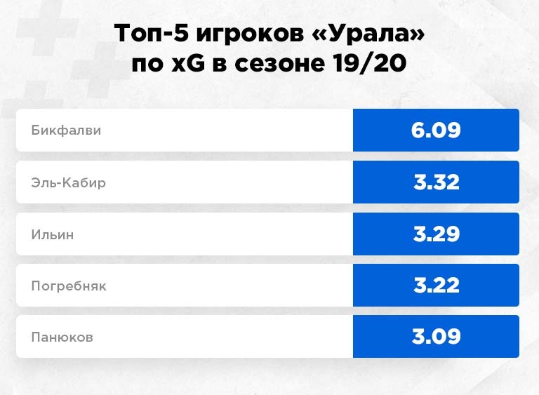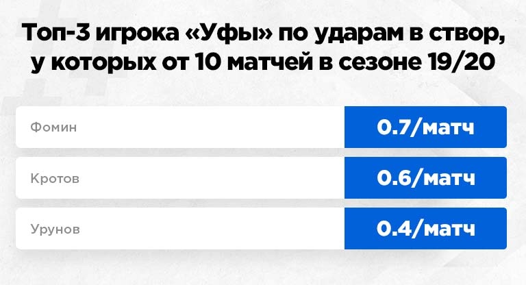 Новичок команды, Тимур Жамалетдинов, выходящий сейчас в основе на позиции форварда, за свои 224 минуты еще не нанес ни одного удара в створ. Другие потенциальные игроки основы, Бизяк и Агаларов, также для форвардов имеют плохую статистику по УВС. На фоне всего этого "Уфа" разгромно проигрывает свои последние матчи по ударам в створ, а Беленов - лучший в лиге на старте сезона по сейвам.