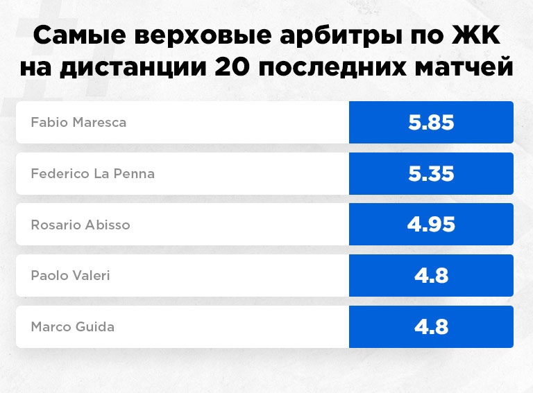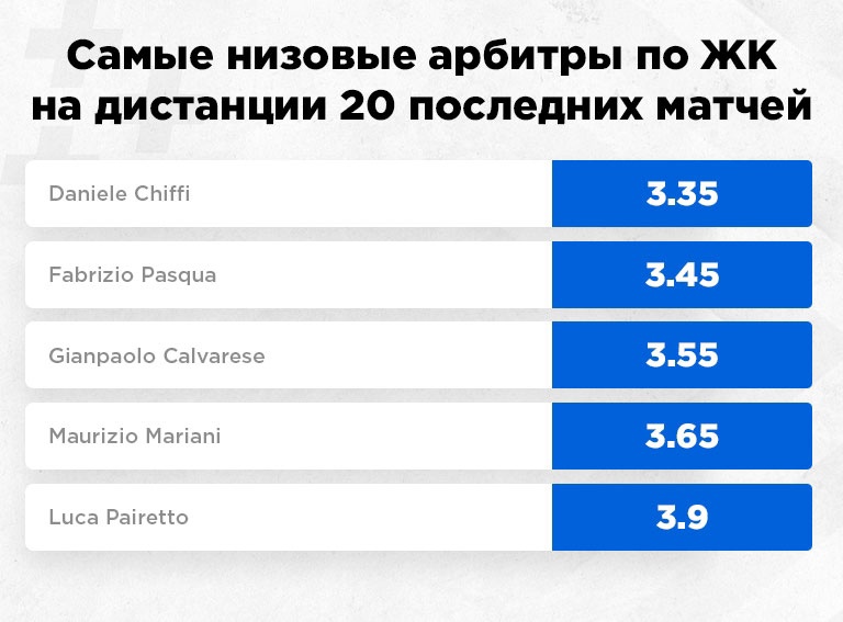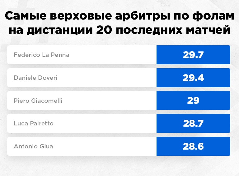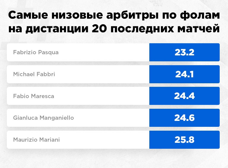 У итальянцев такое распределение матчей, что по одному сезону судить не лучшая идея об арбитрах, там может быть совсем мало матчей у них. Поэтому для оценки арбитров просто будем учитывать 20 последних матчей в Серии А.