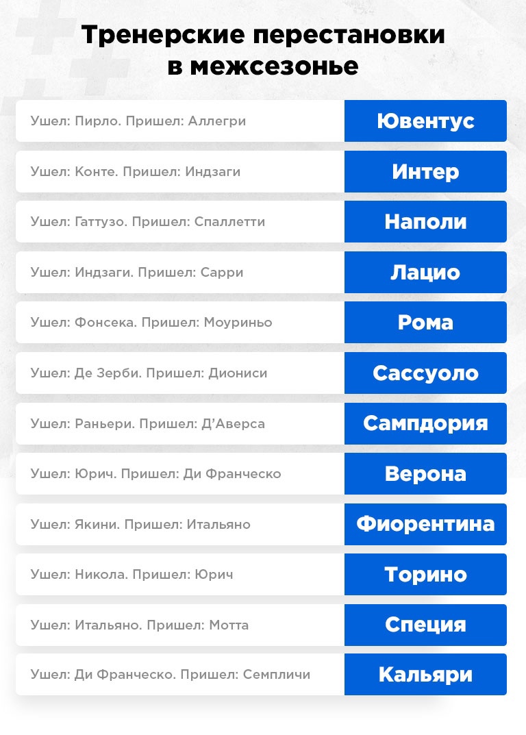 Тут и возвращение Аллегри, и очередной клуб Моуриньо, и новые вызовы для Индзаги с Сарри. Многие переходы произошли именно внутри лиги: Итальяно из "Специи" в "Фиорентину", Индзаги из "Лацио" в "Интер", Юрич из "Вероны" в "Торино", Ди Франческо из "Кальяри" в "Верону". За ними стоит отдельно последить, перенесут ли тренеры свои тренды из прошлого клуба в новый.