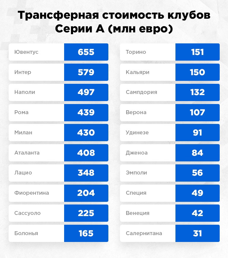 Самый большой рост произошел у клубов из Серии Б, ну это и не удивительно, так в каждом чемпионате происходит. "Венеция" подорожала на 86%, "Эмполи" на 42%, но они итак имели неплохой состав, и "Салернитана" также около 40%, у этой команды будет самый дешевый состав в лиге.