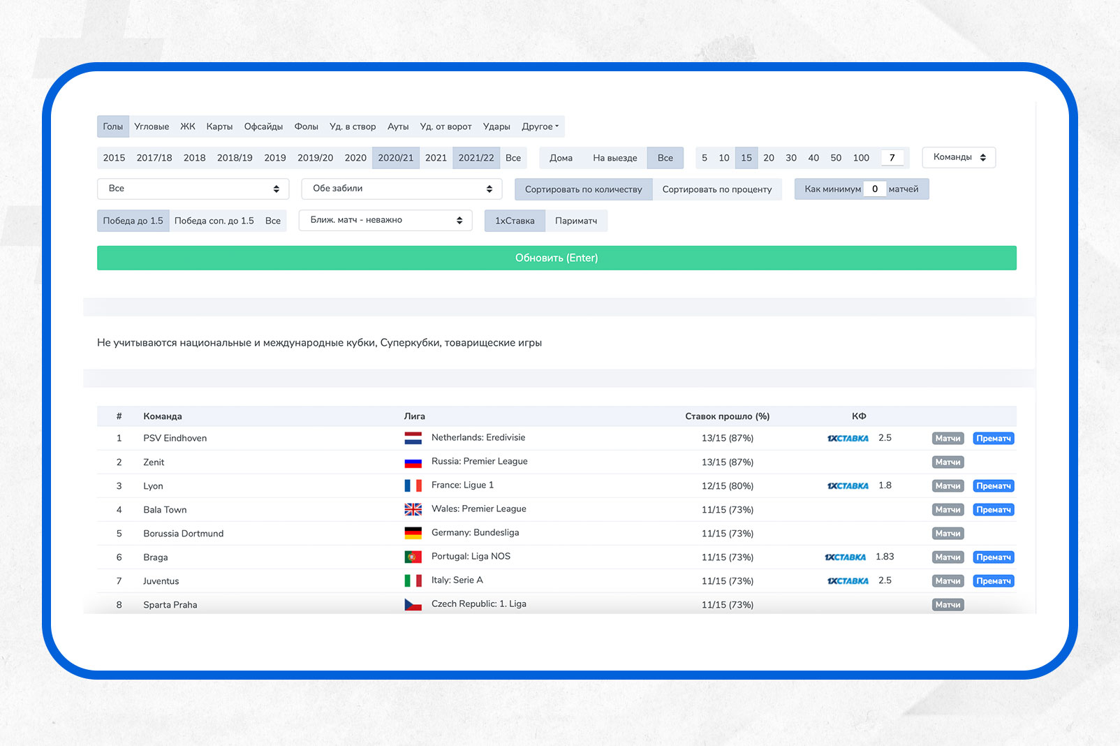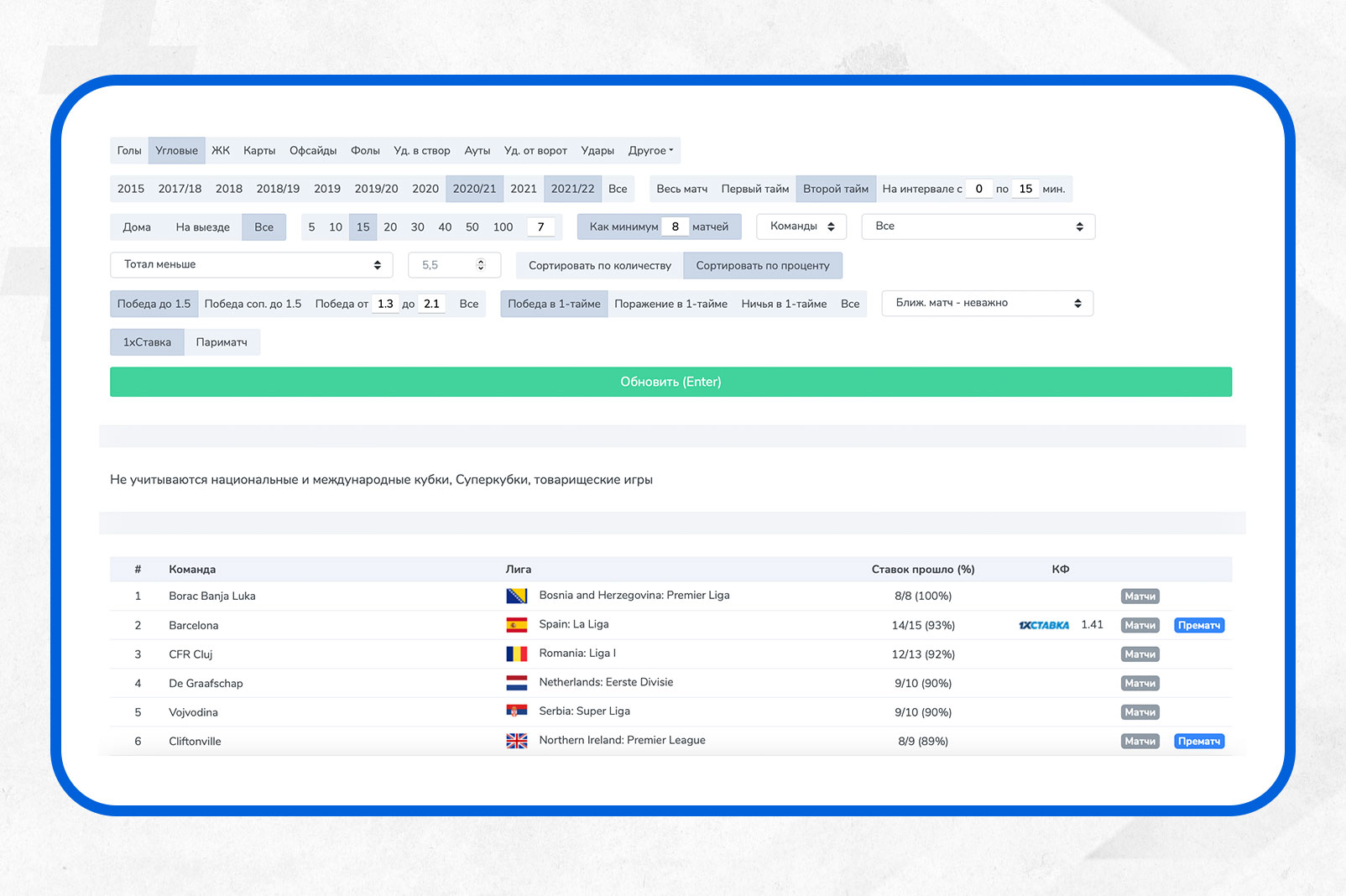 Кстати, не все тренды, даже, если они нравятся вам применительно к конкретному матчу, стоит играть до матча, что-то целесообразно оставить на лайв, чтобы дать кэфу подрасти и взять "обе забьют" не за 1.7, а за 1.85. Или поймать “тотал меньше угловых соперника” за хороший кэф в середине матча. В этом вам поможет функция Домашние Заготовки, пока что также бесплатная.