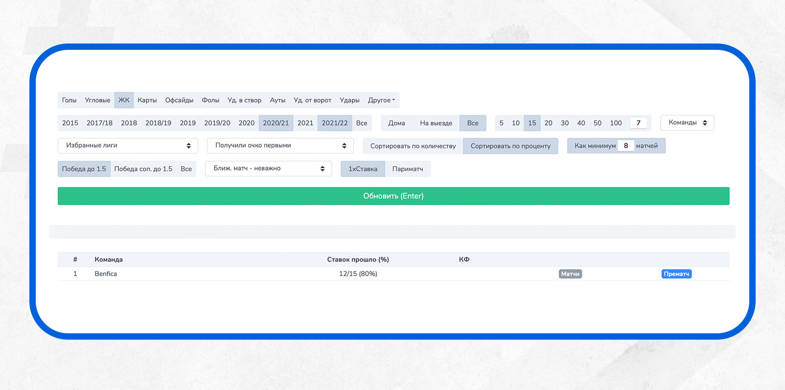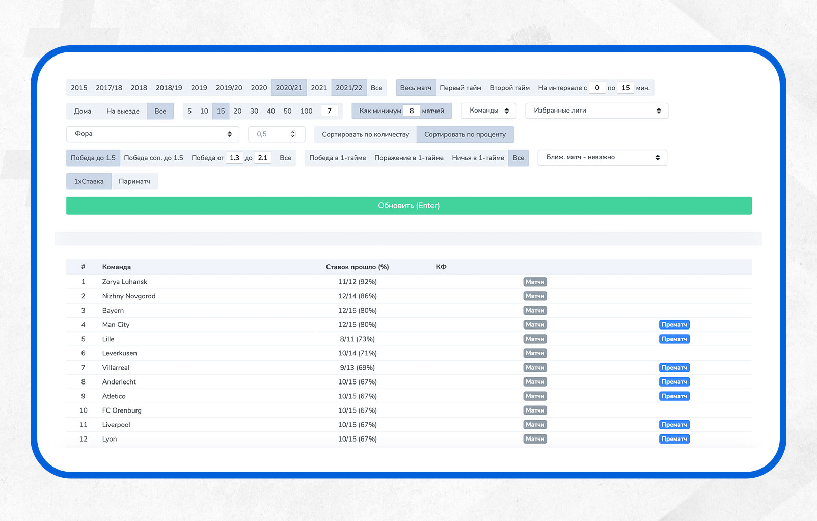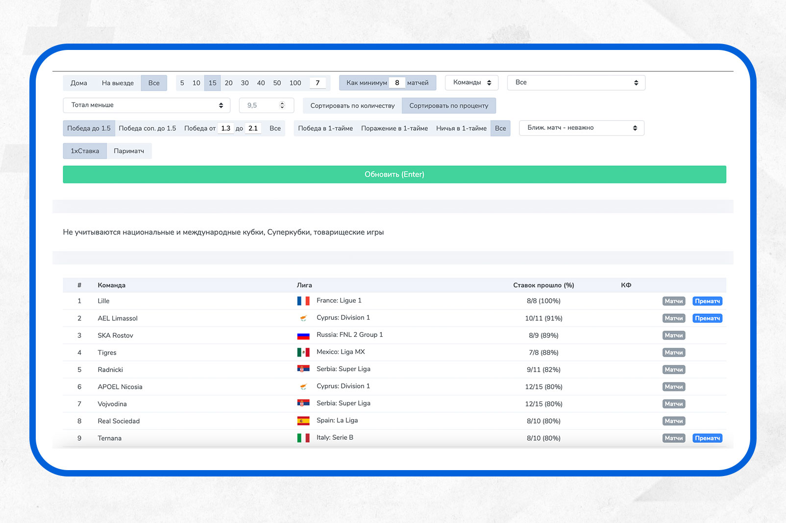 Здесь мы добавили дополнительное условие - не меньше 8 матчей, где команда была таким фаворитом, чтобы убрать совсем редкие и случайные варианты.