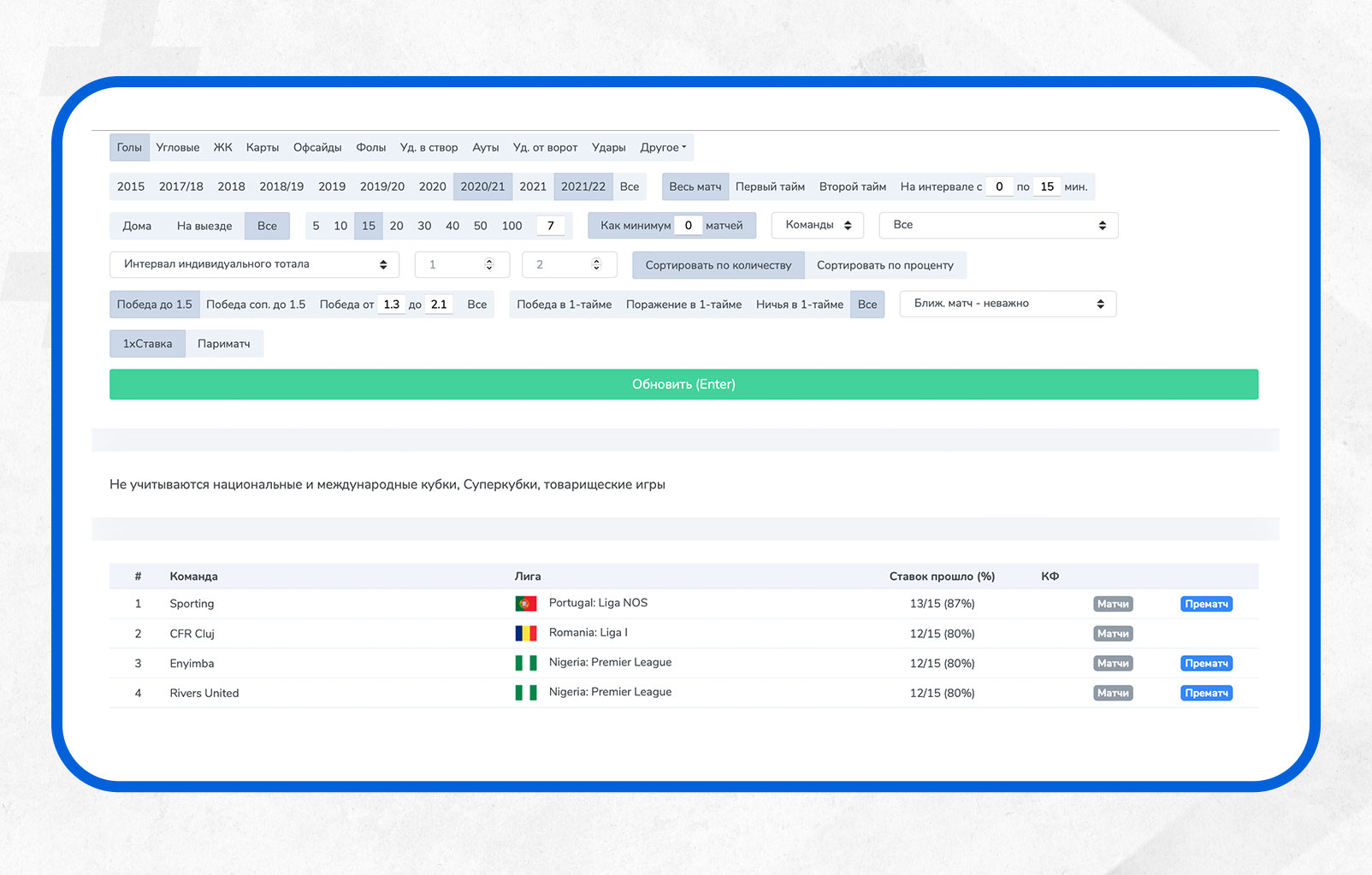 Первичного отбора ставок, это важно! Ведь сами по себе тренды это, конечно, хорошо, но играть их вслепую нынче - путь к сливу. Надо смотреть соперника, анализировать конкретный матч, судью и тп. А еще при смене тренера или серьезной ротации состава важность трендов существенно падает, так как игра команды в большей или меньшей степени меняется. Но тренды - отличная стартовая точка, то, с чего можно начать разбор игрового дня.