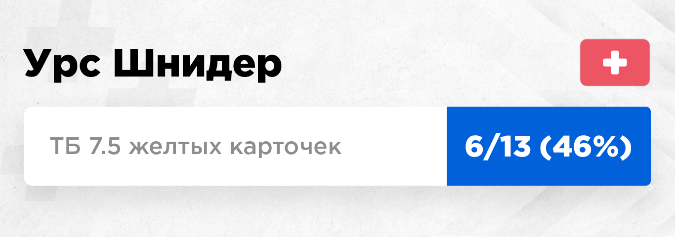 Один из двух самых верховых судей чемпионата Швейцарии в этом сезоне. В прошлом сезоне тоже был в топ-3. Его средний тотал в районе 6, но при этом он все равно регулярно выдает матчи с очень большим количеством карт. Я думаю понятно, что суть этой подборки именно в возможности ловить большие коэффициенты, потому что средние плечи, например, в Швейцарии, в районе 5.5 ЖК. Тут интересны как раз такие персонажи, как Шнидер, у которых среднее значение в рамках разумного, но при этом все равно достаточно суперверховых матчей.