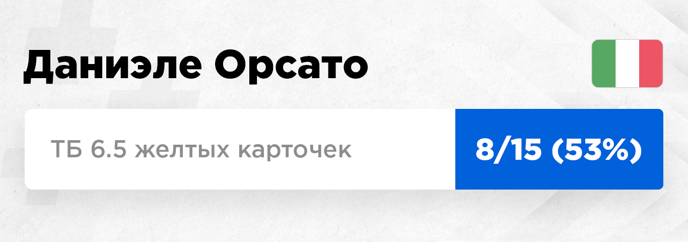 Закончим единственным представителем топ-чемпионатов в нашей подборке. В Италии сейчас такими цифрами мало кого удивишь, там какой-то совсем нетипичный сезон получается. Чтобы вы понимали, в прошлом сезоне ни у одного из арбитров не было хотя бы 6 ЖК в среднем за матч. В этом сезоне таких аж семь. Орсато – один из них, и именно он чаще остальных пробивал тотал 6.5 ЖК, если учитывать кубки. Кстати, запомните его в преддверии ЛЧ. В этом сезоне он судил там 5 матчей и показывал в среднем 6.8 желтых за игру. Это самый высокий показатель среди тех, у кого было от трех матчей в турнире.