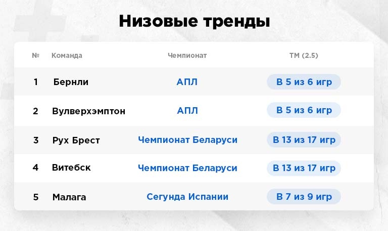 В чемпионате Беларуси тоже есть два "низовых" клуба – это новичок "Рух Брест" и "Витебск". Оба стремятся сохранить прописку в лиге и ради этого они ставят на оборону. Команды хорошо сыграны и обучены тактически, в результате чего 76% матчей с их участием играются на тотал меньше.