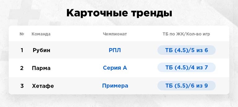 Кроме того, популярны рынки желтых карточек. Мы постарались отобрать наиболее стоящие карточные тренды, но вы можете их дополнить в комментариях. Если сочтете наш выбор не таким идеальным. Мы обратили внимание на "Рубин" в РПЛ и "Хетафе" в Примере – оба клуба держат марку после рестарта кампании. Кроме того, матчи итальянской "Пармы" частенько получаются богатыми на карточки.