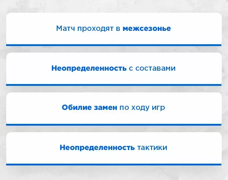 - Матчи проходят в межсезонье – готовность игроков и клубов никому неизвестна;