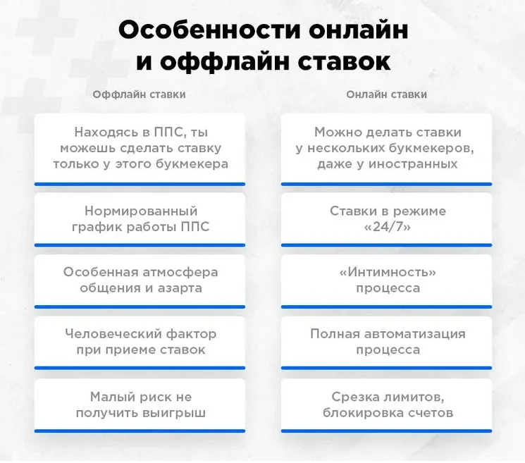 В таблице ниже приведены особенности оффлайн и онлайн ставок в сравнении друг с другом. Что из этого плюс, а что минус — решай самостоятельно!