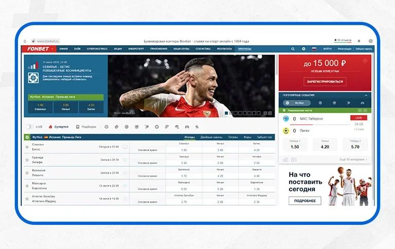 Первой букмекерской компанией в нашей стране стал открытый в 1994-м году «Фонбет». Он же впервые стал принимать и онлайн-ставки шесть лет спустя. «Фонбет» до сих пор остается одним из лидеров онлайн-беттинга в России. Главная страница сайта букмекера выглядит так: