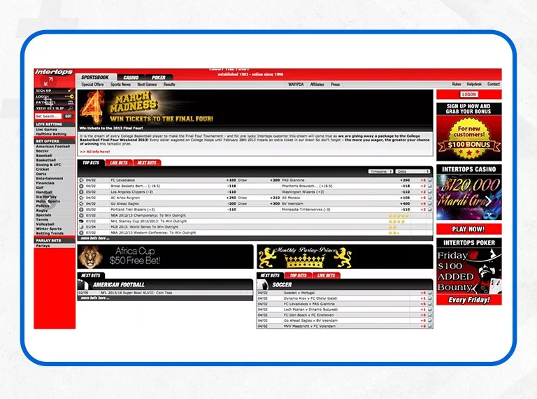 Еще одна переломная дата для онлайн-беттинга — 17-го января 1996-го года. В этот день клиент БК InterTops из Финляндии Юкка Хонковаара сделал первую в мире онлайн-ставку. Его выбор пал на матч Кубка Англии между «Херефордом» и «Тоттенхэмом». Вот как выглядит современный интерфейс сайта БК InterTops: