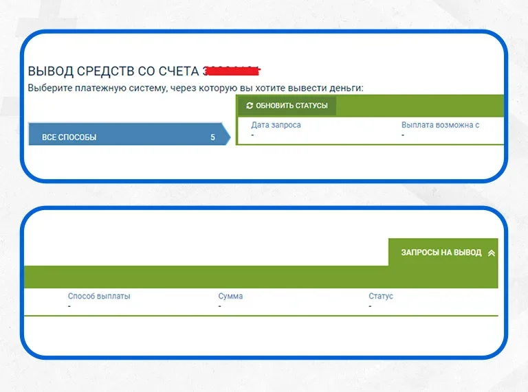 После подтверждения суммы вывода статус обработки вашей заявки можно посмотреть в подразделе «Запросы на вывод»: