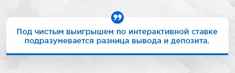 В случае, когда чистый выигрыш беттора по интерактивной ставке составил 15 000 рублей и более, налог государству платит сам букмекер, но в этом случае БК формально может удержать с игрока 13% от выигранной суммы. Однако практически все легальные БК, чтобы не отпугивать клиентов, выплачивают всю сумму выигрыша полностью.