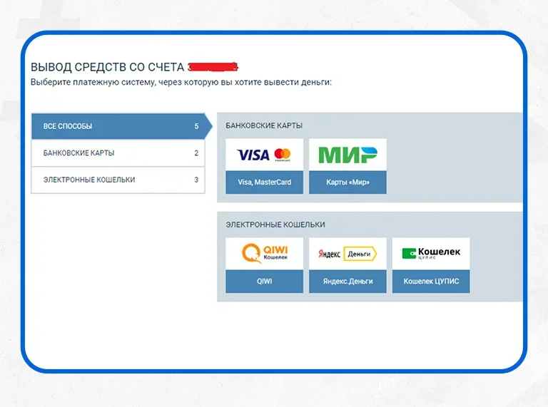 Легальные российские БК выплачивают денежные средства на банковские карты Visa, Mastercard и МИР, а также на электронные кошельки QIWI, Яндекс.Деньги, Монета.ру и ЦУПИС. Кроме того, БК, подключенные ко второму ЦУПИС: «Фонбет», «Леон» или «Олимп» — допускают вывод средств и на баланс мобильных операторов (МТС, «Билайн», «Мегафон», Теле2).