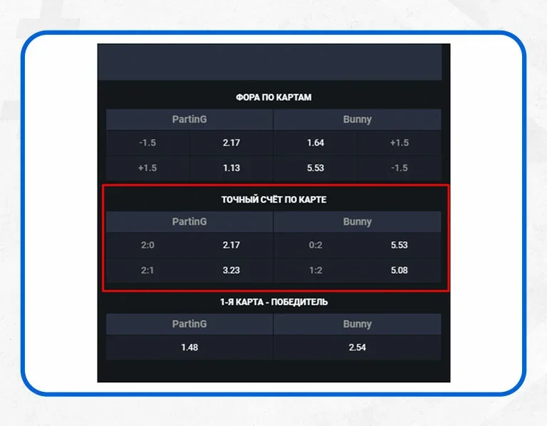 В матче между PartinG и Bunny в формате BO5 первые две карты закончились за 14.5 и 17 минут соответственно. Это означает, что в третьей карте необходимо поставить на продолжительность свыше 20 минут. Если и третья карта оказалась “микро”, то требуется продолжать ставить на противоположный исход, пока ставка не пройдет.