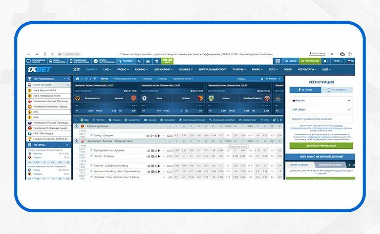 Страница зеркала БК 1ХBet — дизайн идентичен легальной отечественной БК «1ХСтавка». Однако, есть разделы «Казино», «Тото», «Покер» (запрещенные российским законодательством):