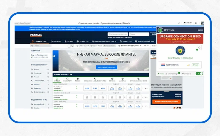 Ниже показана главная страница официального сайта БК Pinnacle. Вход осуществлен с помощью включенного плагина Browsec: