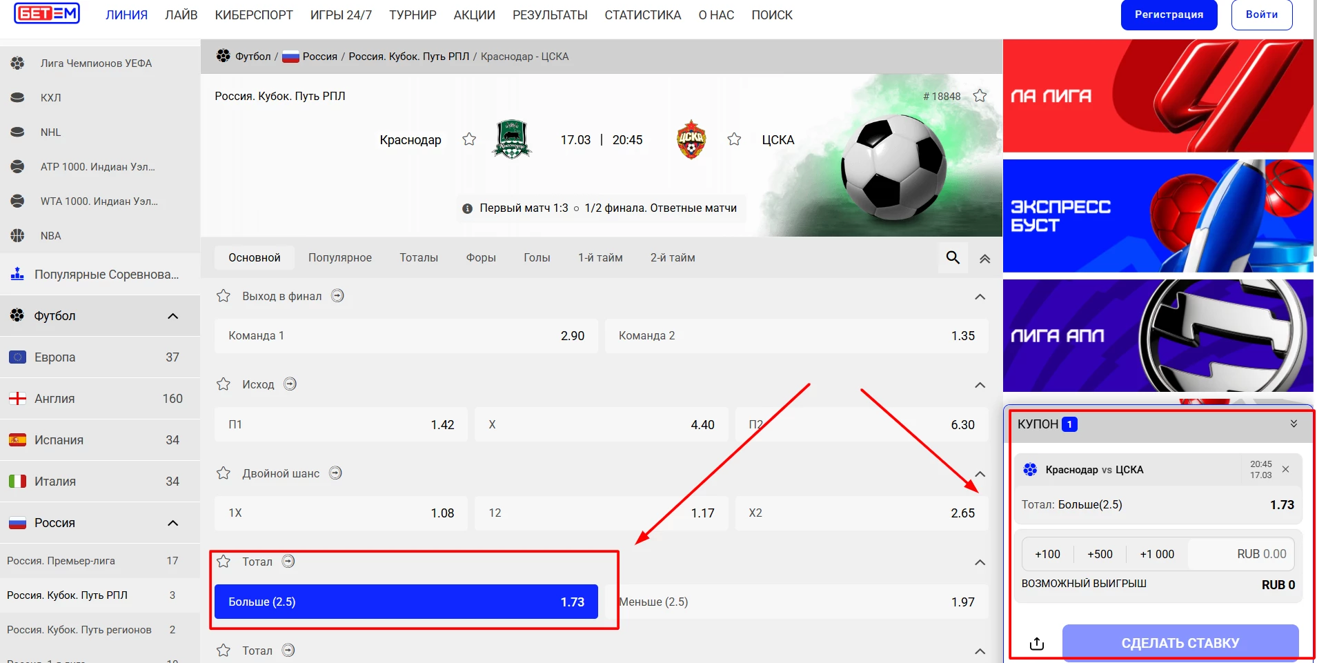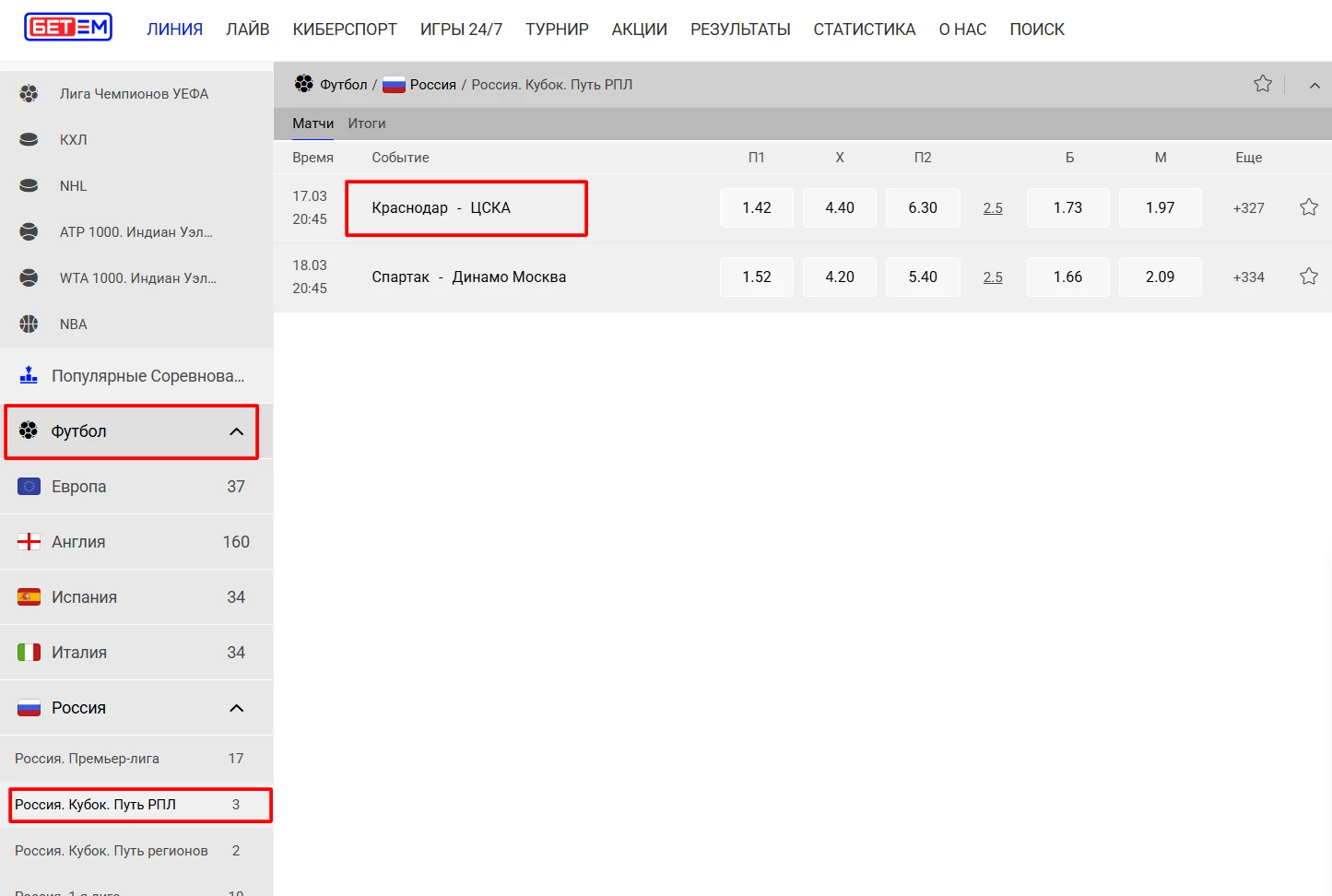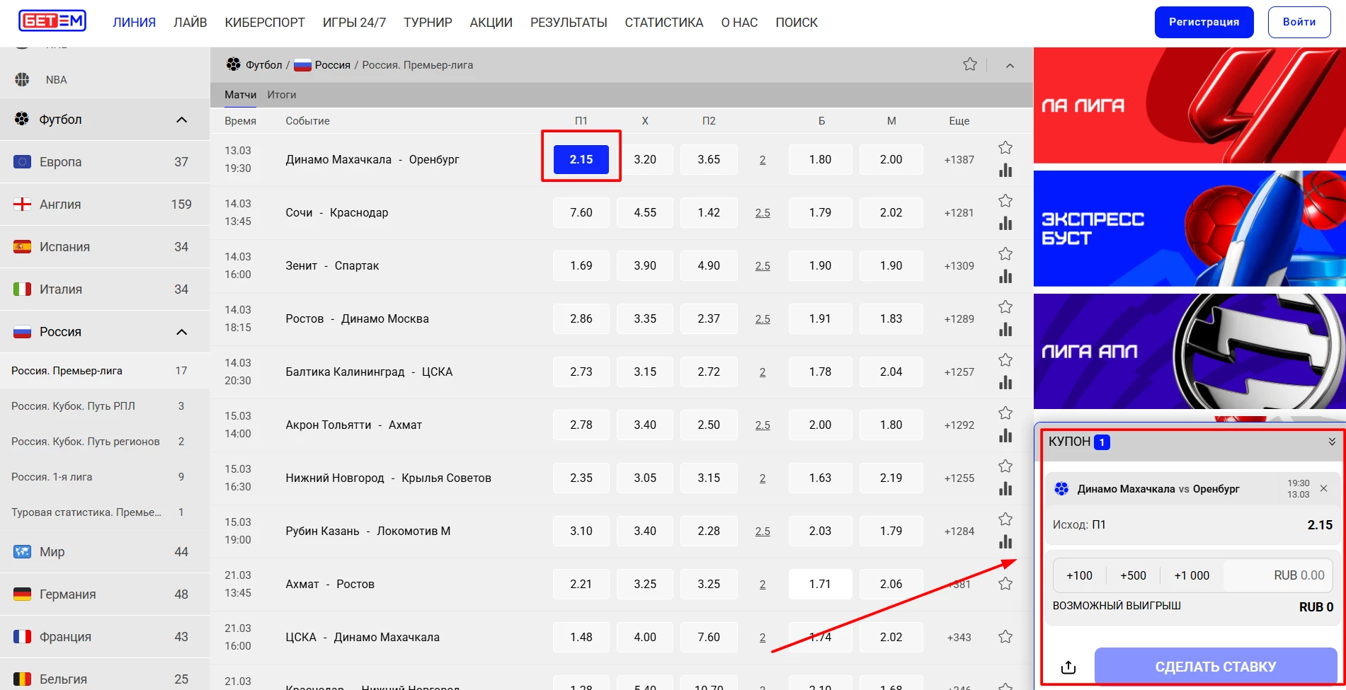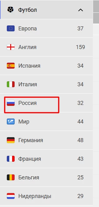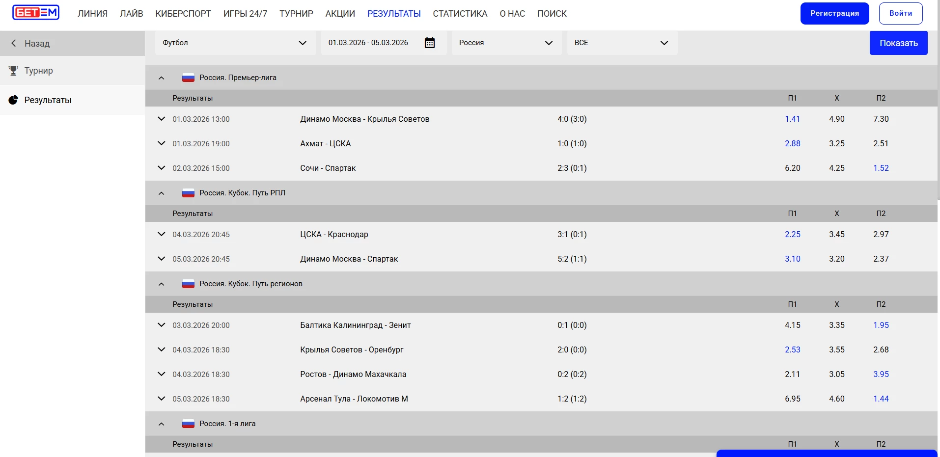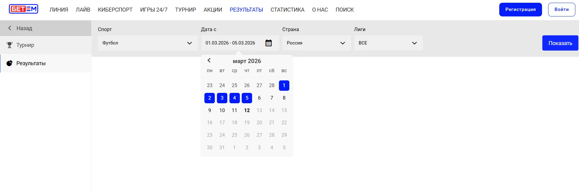 Например, выберем вид спорта «Футбол», дату с 1 по 5 марта, страну «Россия» и все лиги. Нажмем на кнопку «Показать».
