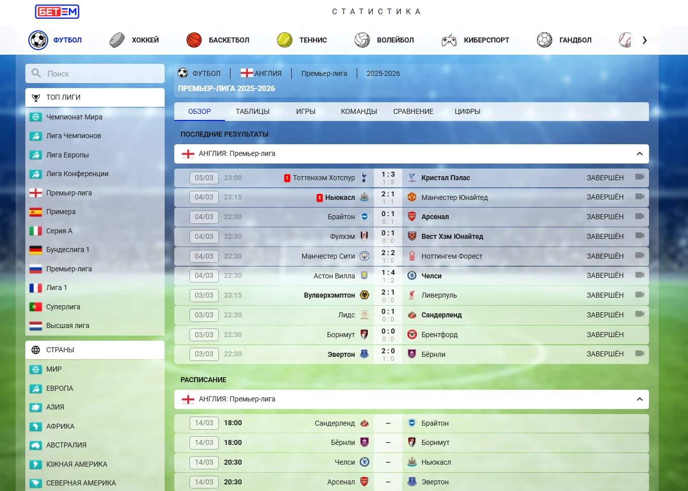 - «Обзор» (последние результаты и расписание);