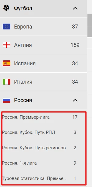Раздел «Статистика» более информативный и помогает игрокам провести детальный анализ формы команд перед заключением пари. В левом меню расположены топ лиги и список стран.