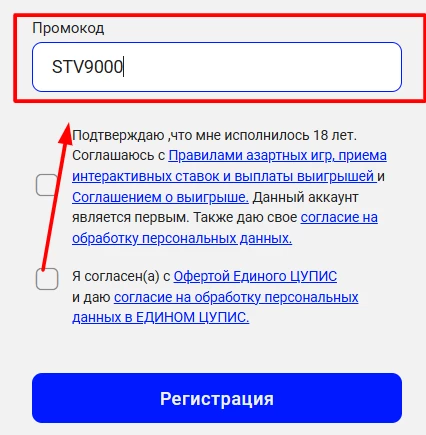 Промокод STV9000 позволяет увеличить размер приветственного бонуса до 9 000 ₽.