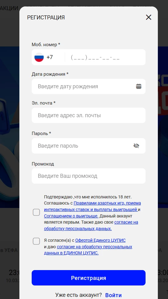 - На экране отобразится анкета. Необходимо заполнить все поля. Для увеличения приветственного бонуса можно ввести промокод (например, ).