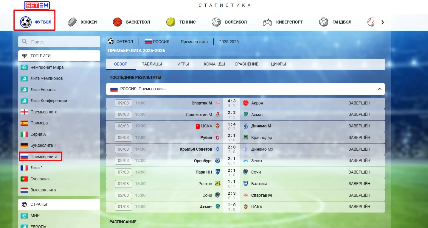 Сверху страницы пользователи могут выбирать нужную спортивную дисциплину. Для примера, мы выбрали футбол, затем «Премьер-лига» (Россия). В центре страницы отобразились блоки: «Последние результаты», «Расписание», «Турнирная таблица».
