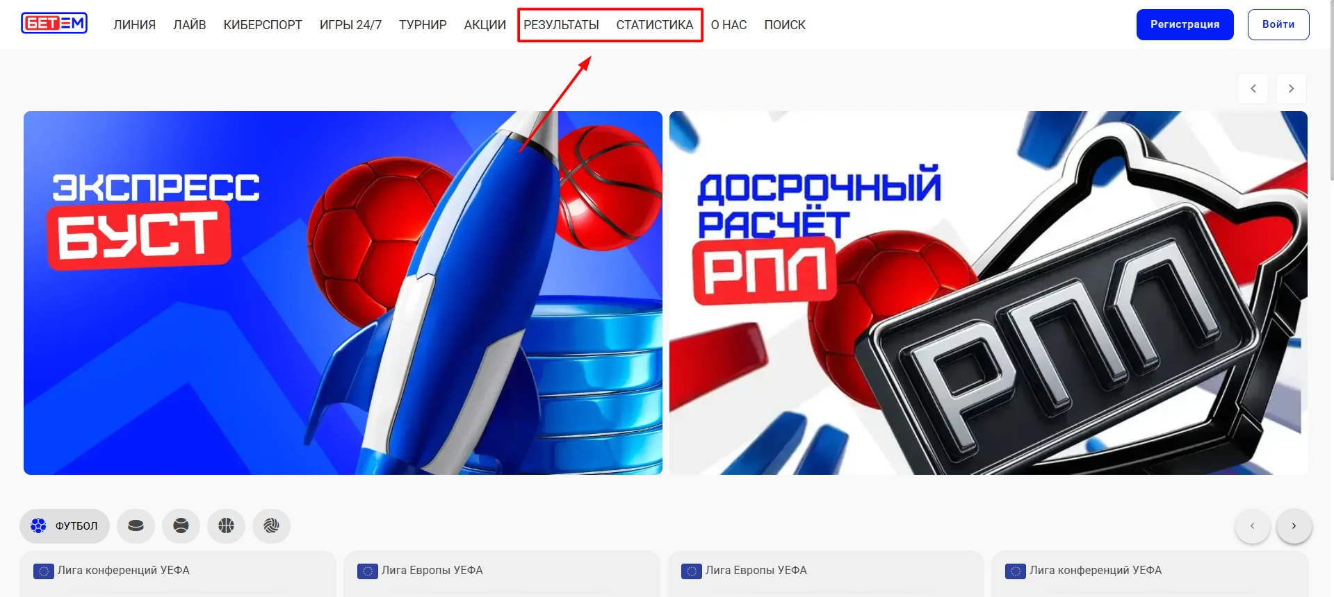 Бет-М предлагает разделы «Результаты» и «Статистика». Они предназначены для быстрого отслеживания исходов и проведения глубокого анализа данных перед заключением пари.
