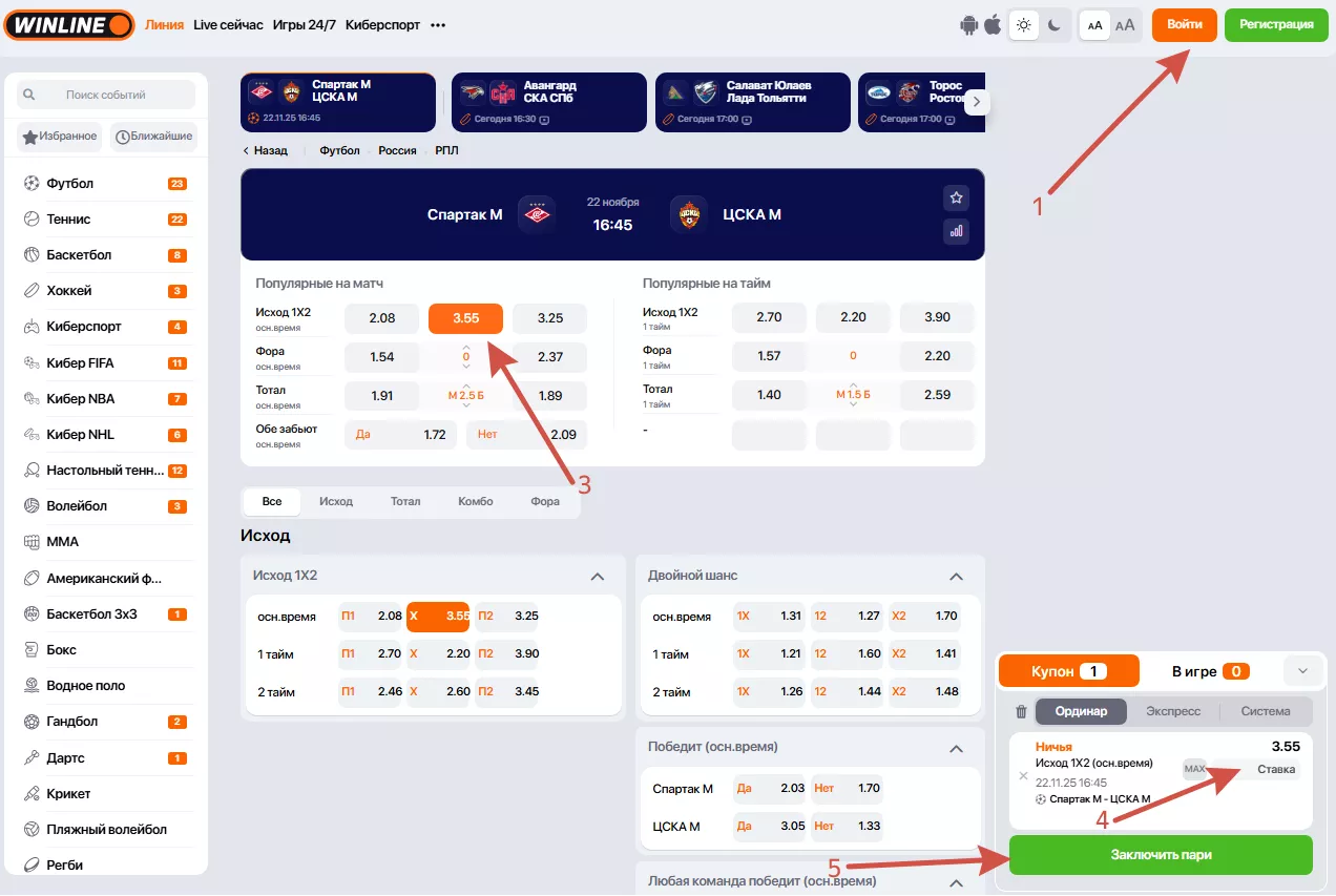 Процесс оформления пари в букмекерской компании Winline включает несколько этапов: