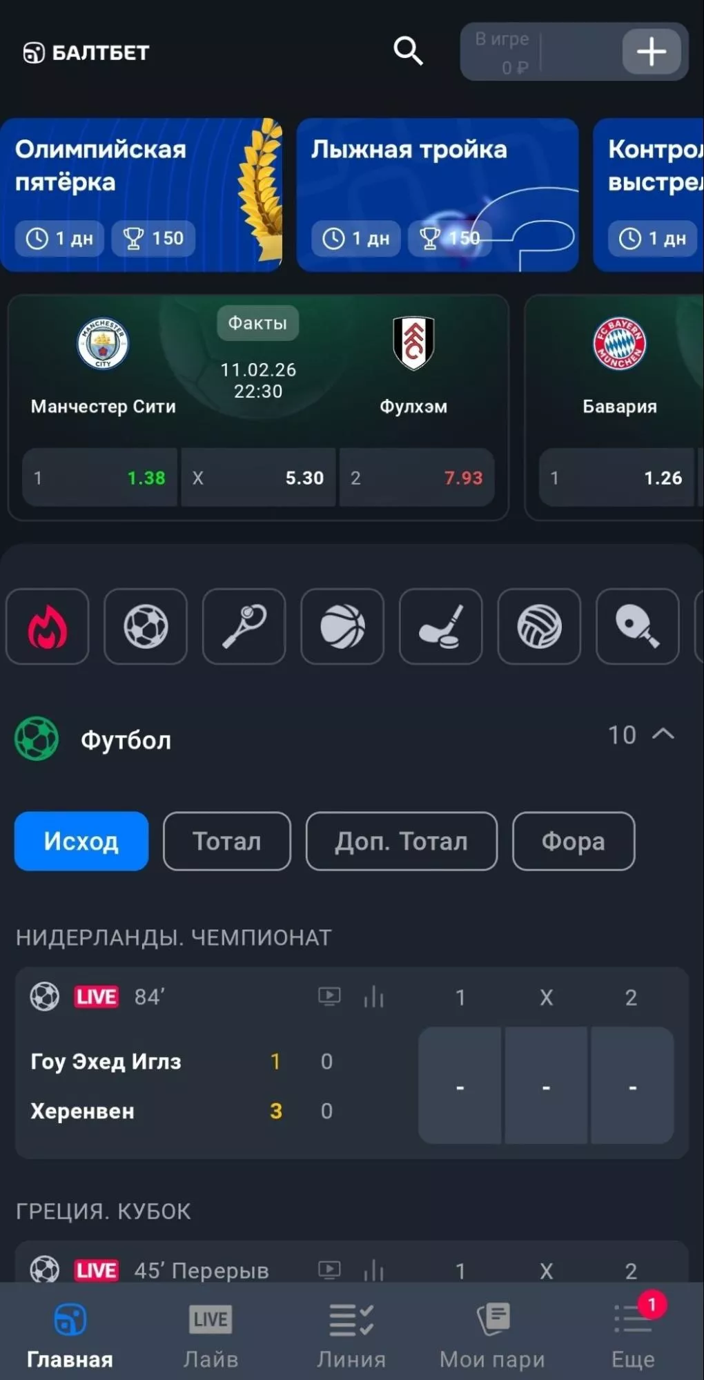 Балтбет хорошо подходит тем, кому близка классика: спокойный интерфейс без лишних усложнений и акцент на традиционные виды спорта — футбол, хоккей, баскетбол, волейбол, теннис. Акции выходят регулярно, часто — каждую неделю: это не про огромные суммы, но 200–500 рублей фрибетов реально получить, если выполнить простые условия.