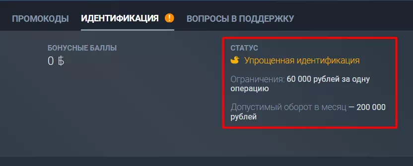 Если проверка пройдена, игрок увидит статус «Упрощенная идентификация». Под ним вся информация об ограничениях (максимальная сумма пополнения, допустимый оборот в месяц).