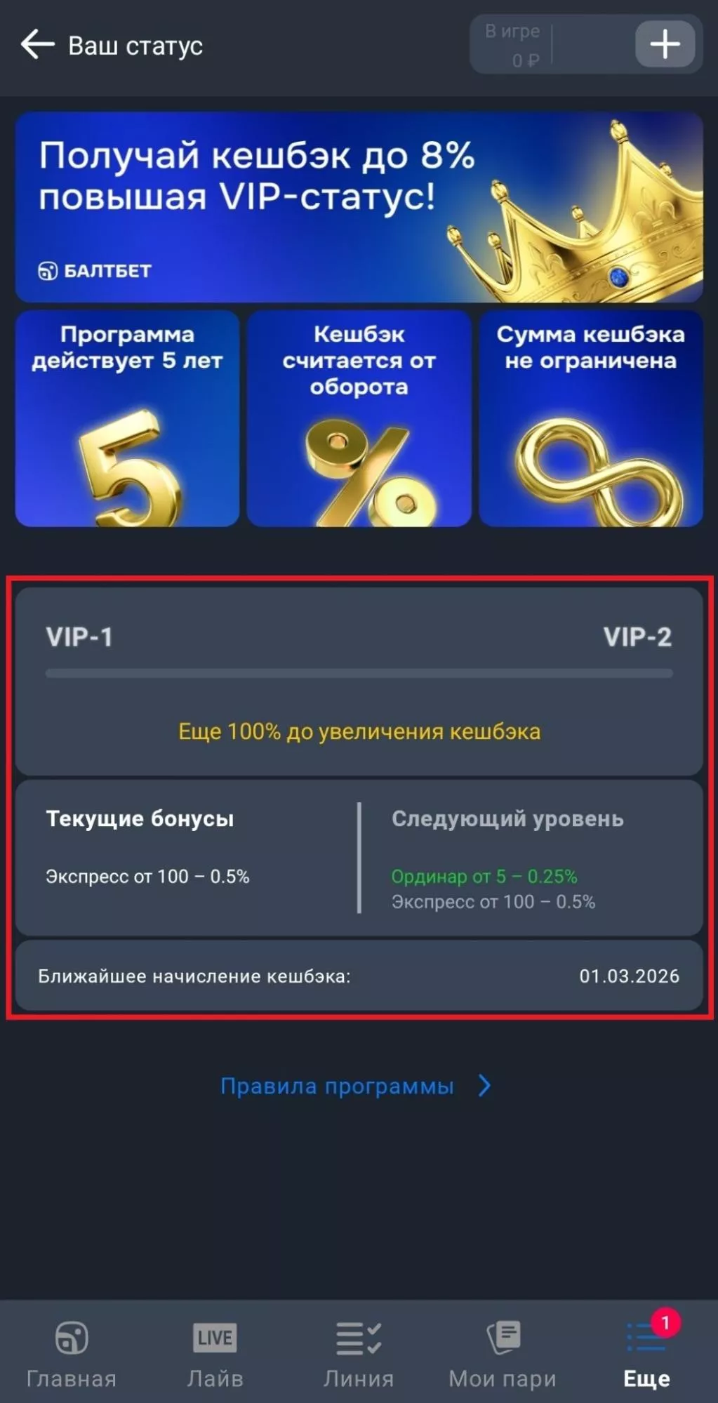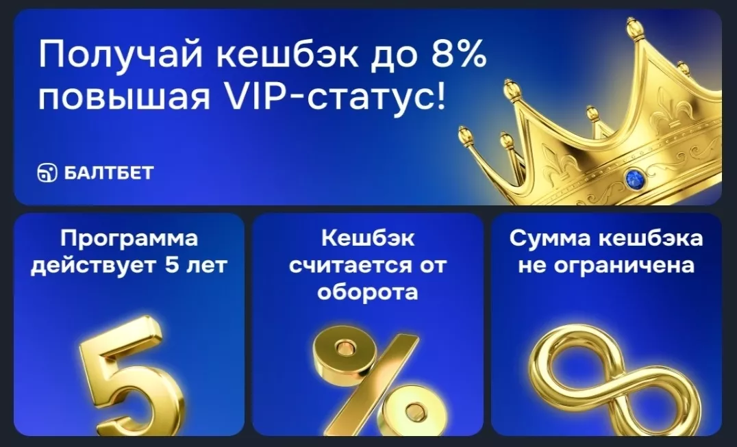 В Балтбет действует программа лояльности «VIP-статус», которая подключается автоматически после регистрации и рассчитана на всех игроков.