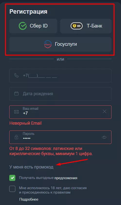 Дополнительно поле — «У меня есть промокод». Актуальный список промокодов Балтбет мы собрали на отдельной странице. Лучше посмотреть, изучить и активировать, потому что уже на старте можно ухватить, например, эксклюзивный фрибет или повышенный бонус.