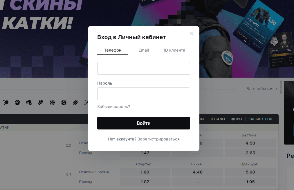 - Ввода номера телефона, ID клиента или электронной почты;