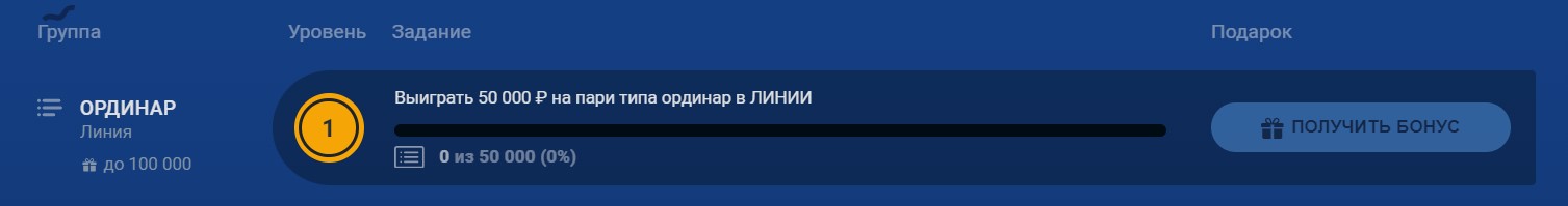 Выиграть 50 000 рублей на пари вида ординар в линии. Игрок оформляет пари в линии с кф 1.80 на сумму 1000 рублей и выигрывает 1800 рублей. Затем чистый выигрыш 800 рублей прибавляется к общей сумме на шкале.