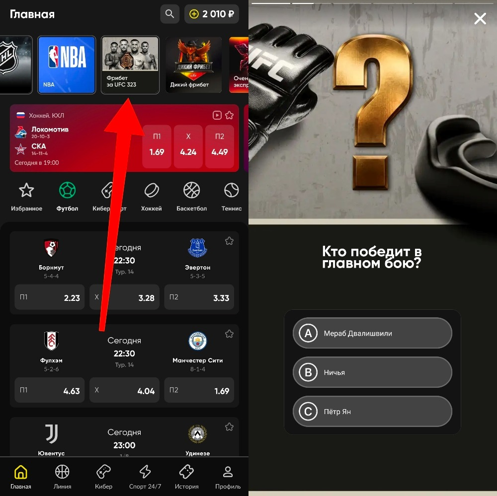 Все, кто даст верные ответы на 4 вопроса и сделают ставку на UFC, получат гарантированный фрибет на 1000 рублей. Начисление бесплатных ставок — 8 декабря.
