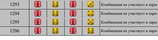 🔻 Важно: если в двух бросках выпадет сочетание из позиций 1293–1296, эти результаты не учитываются и кубики бросают повторно. При технических неполадках пари не аннулируются, а автоматически переносятся на следующий раунд.