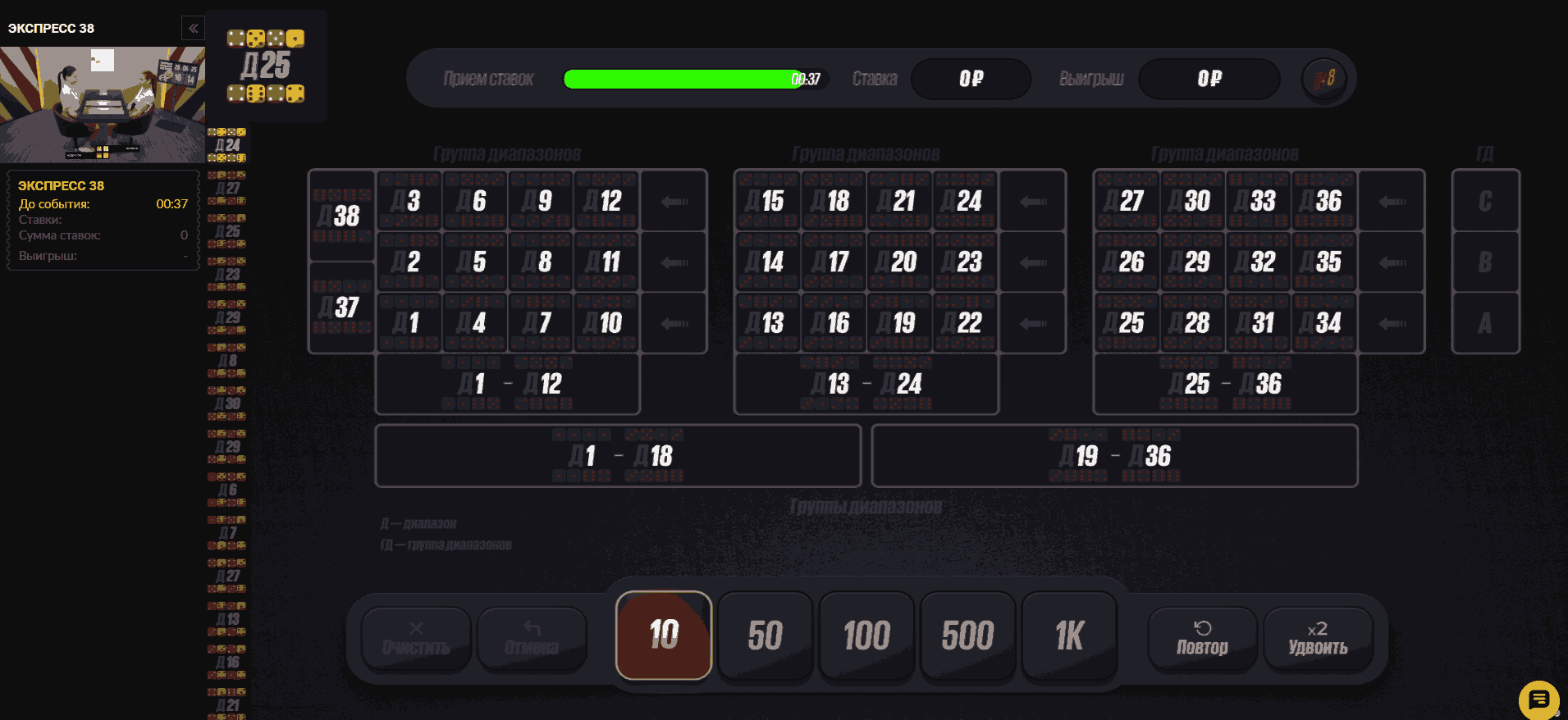 Экспресс 38 от BetBoom – это быстрая игра по мотивам классических нард, где основная задача – угадать комбинацию значений из двух бросков кубиков. Все проходит в режиме реального времени. Ставки принимаются на конкретные сочетания цифр или на целые диапазоны значений.