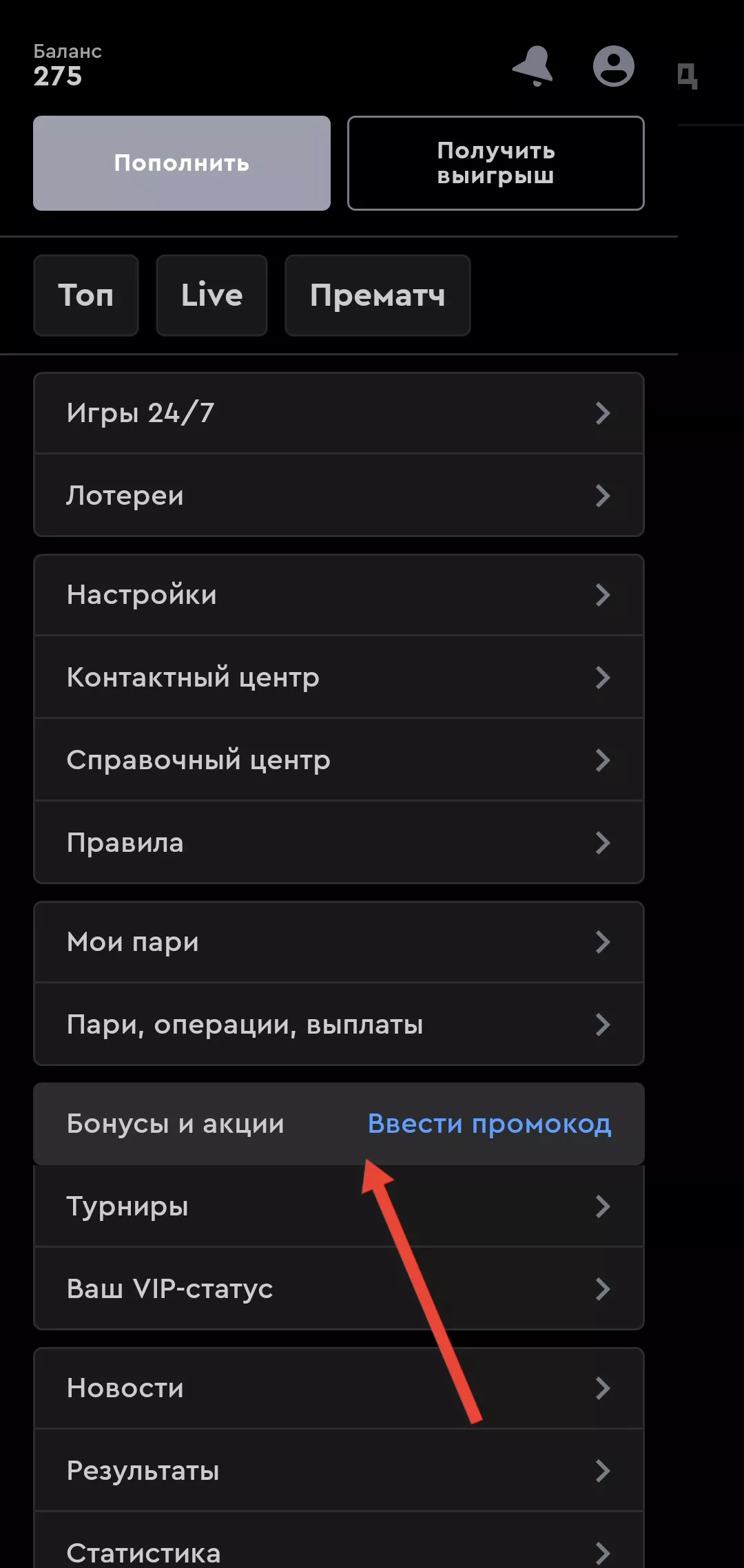 - Открой раздел «Бонусы и акции» → вкладка «Промокод».